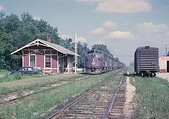 During the Great Depression, the railroad trimmed operations by closing facilities and abandoning trackage.[16] It purchased its first diesel-electric locomotive, an 800 horsepower (600 kW) yard switcher from Westinghouse, in 1934.[17] In 1935, the CGW began trial operations of trailer on flatcar trains, which were expanded the following year into regular service, initially between Chicago and St. Paul, but rapidly expanding across the system by 1940.[12] In 1941, it was reorganized in bankruptcy, and late in the decade a group of investors, organized as the Kansas City Group, purchased the CGW.[12] In 1946, a demonstrator EMD F3 diesel locomotive set operated on the CGW, immediately prompting the company to purchase a wide variety of diesels, and by 1950 the railroad had converted completely to diesel motive power.[14] In 1949, William N. Deramus III assumed the presidency, and began a program of rebuilding infrastructure and increasing efficiency, both by consolidating operations such as dispatching and accounting and by lengthening trains.[18] In 1957, Deramus left the company, and Edward Reidy assumed the presidency.[18]