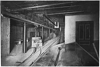 Initially, the intended purpose of the narrow gauge railroad below the telephone cables was limited to hauling out excavation debris and hauling cable spools during the installation of telephone lines,[7] but in 1903, the company renegotiated its franchise to allow the use of this railroad for freight and mail service. In early 1905, the system was taken over by the Illinois Tunnel Company. By this time, 26 miles (42 km) of a projected 60 miles (97 km) of tunnel had been completed.[8][9] The actual construction work was subcontracted to the Illinois Telephone Construction Company, under the management of George W. Jackson (1861–1922).[10][11][12][13]