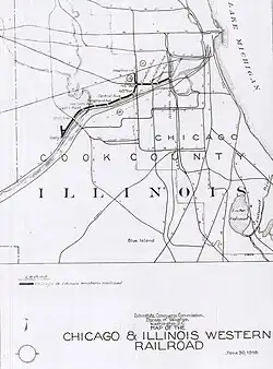 The Chicago and Illinois Western Railroad (C&IW) was incorporated February 26, 1903, by Dolese and Shepard, a limestone mining company. They had a quarry in "Hawthorne" (Cicero) and wanted to connect with their larger quarry near "Gary", Illinois (a railroad station in Hodgkins). This section was completed in 1907.[1][2][3]
