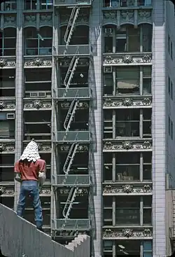 The statue was originally built in the 1960s for the Chicken Boy Fried Chicken Restaurant, which was located in Downtown Los Angeles on Broadway between 4th and 5th streets, near the Grand Central Market. At that time, International Fiberglass Company of Venice was manufacturing roadside Paul Bunyan and Muffler Man statues for use as outdoor advertising. The Chicken Boy restaurant bought one and hired an artist to customize it. A chicken head was fabricated to replace the man's head. The arms were re-worked to face forward and hold a bucket, rather than an axe. The statue remained in place until 1984 when the restaurant owner died. The statue was eventually given to artist Amy Inouye. She stored it[2] until 2007, when she moved the Chicken Boy statue to its current location at 5558 North Figueroa Street.[3] Her design firm, Future Studio, had relocated to a commercial space that had a reinforced roof strong enough to support the statue. The Chicken Boy statue was preserved as a result of community effort and donated funds.