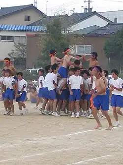 A similar Japanese game called kibasen (騎馬戦; literally "cavalry fight") is commonly played as part of an annual sports day event at elementary and junior high schools. It is a field event rather than a swimming event. In it, a team of four competitors work together, with three carrying the fourth, who wears a bandana (hachimaki) or hat. The team is defeated if they are knocked over or, more commonly, if their bandana/hat is removed by an opponent. Competitors are often divided into opposing red and white factions. In recent years some schools have removed physically demanding events such as the kibasen from sports day programs due to the risk of serious injury. In a 2003 incident a high school student in Fukuoka Prefecture was left quadriplegic after falling from his teammates' shoulders.[1]