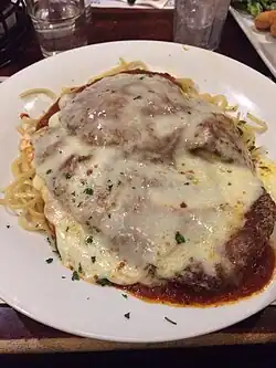The dish originated in the Italian diaspora in the United States during the early 20th century.[1][4][5][6] It has been speculated that the dish is based on a combination of the Italian parmigiana, a dish using fried eggplant slices and tomato sauce, with a cotoletta, a breaded veal cutlet generally served without sauce or cheese in Italy.[6]