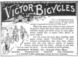 During the late nineteenth century, Chicopee Falls became a major manufacturing center of bicycles.[29] The town was the site of at least two bicycle factories: The Overman Wheel Company (1882 to about 1899), and the Spalding sporting goods company.[30]