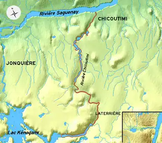 Flowing from south to north, the Chicoutimi River rises east of Kenogami Lake via the Portage-des-Roches dam in the old town from Laterrière (today Chicoutimi borough to Saguenay (city)). This river is artificially controlled over 26.2 km (16.3 mi) [5] in distance and 150 m (490 ft) in elevation for a century.[6]