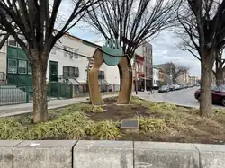 This plaza was reconstructed in 1997, providing a concrete border, four trees and the Freedom’s Gate sculpture by Charles Searles (1934-2004). Born in Philadelphia, his art captures the history and feelings of the African-American experience.[3]