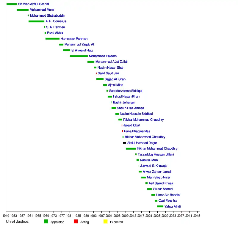 The first chief justice was Sir Abdul Rashid.[8][9] The current chief justice is Yahya Afridi, incumbent since 26 October 2024.
