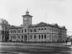 The Chief Post Office or Christchurch Central Post Office, originally known as the Government Buildings,[1] is located in Cathedral Square, Christchurch, New Zealand. The building was initially a post office with Immigration, Customs and Public Works departments. The Government Buildings were later replaced by the new Government Buildings[2] opened in 1913,[3] and the Chief Post Office remained on-site. In 1881, New Zealand’s first telephone exchange was installed in the building. Post services were offered from the building until 2000 when it was re-purposed to house a Christchurch tourist information centre and a restaurant, café and offices.[4] Following the 2011 Christchurch earthquake the building closed. In the early 2020s repairs and strengthening[5] took place. The building was planned to reopen in 2023 in stages, and eventually include a restaurant, shops, and a visitor information centre, under the name "The Grand".[6] The structure is registered with Heritage New Zealand as a Category I heritage building.