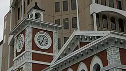 Reputed to be a replica of London's Great Clock of Westminster,[8][29] a working, free standing, four faced turret clock was installed in 1879 within a clock tower.[30] Underneath the east facing clock face is the Royal coat of arms of the United Kingdom.[12] Notable for being unreliable, an electric clock was eventually installed to control the visible faces as slave clocks. While at one time it chimed on the hour and at the quarters,[31] after the mechanisms were damaged in a 1980s fire, the clock became silent.[8]