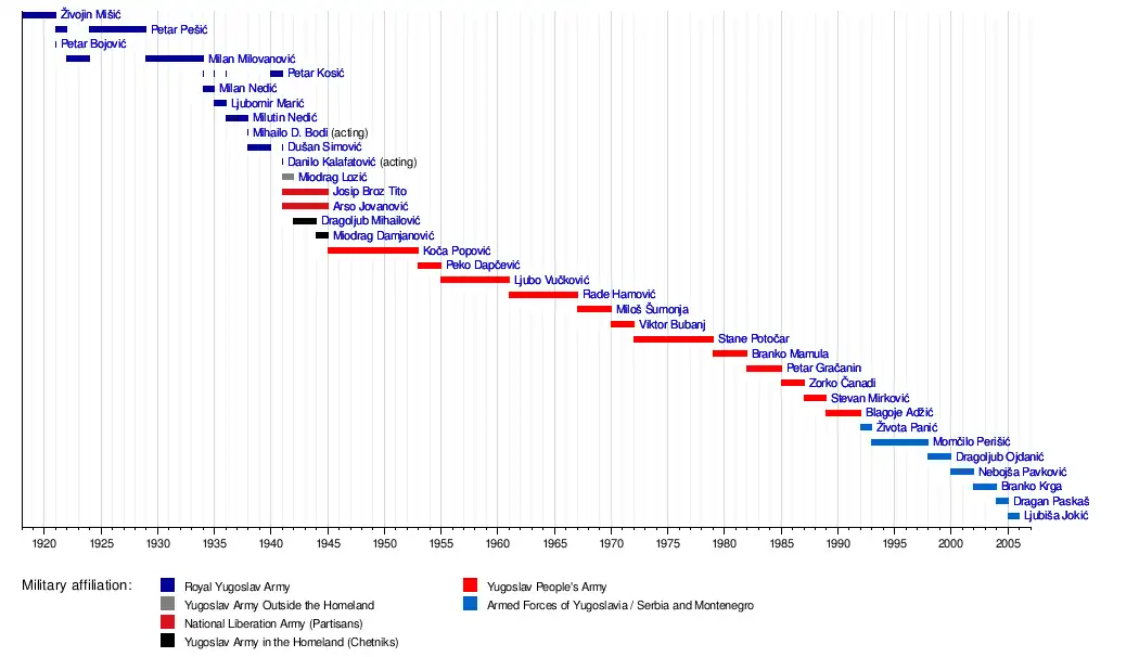 The Chief of the General Staff of Yugoslavia (Serbo-Croatian: Начелник Генералштаба / Načelnik Generalštaba; Slovene: Načelnik Generalštaba; Macedonian: Началник на Генералштабот, romanizedNačalnik na Generalštabot) refers of the chief of the General Staff of the Royal Yugoslav Army from 1918 to 1941, the Yugoslav People's Army from 1945 to 1992 and the Armed Forces of Serbia and Montenegro (officially named the Armed Forces of Yugoslavia between 1992 and 2003) from 1992 to 2006.
