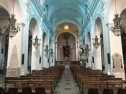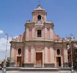The church was first built in the first decades of the 17th-century and consecrated in 1728. The facade has both a bell-tower and a clock. The interior has a Latin cross layout, with a central nave separated from the flanking aisles by ten pillars. The transept altars are dedicated to the patron saints of Centuripe, Santa Rosalia and san Prospero. The nave has a carved wooden pulpit with gilded details.[1] The intricate tile design of the Piazza Duomo in front of the church was added in the late 20th-century.