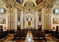 The church, built in late Renaissance style, features a high dome divided in coffers, with lantern and a drum. Such a caisson ceiling is a feature of Renaissance architecture. The plan is a Greek cross one, with nave and transepts of the same length, inspired by the church of Sant'Eligio degli Orefici in Rome, one of the few churches designed and built by Raphael. The church is decorated with frescoes by Cesare Sermei and Giacomo Giorgetti (17th century).