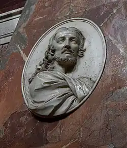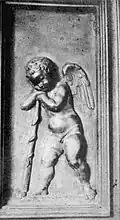 Bernini replaced the reliefs on the base with green verde antico marble panels framed by the original giallo antico mouldings. Only one relief survived, the above-mentioned Christ and the Samaritan Woman (now on the altar-front), which illustrated Christ's words on the water of eternal life. Fabio Chigi in his above-mentioned letter in 1626 mentioned another bronze relief on the short side of the base facing the entrance of the chapel. This was identified by Enzo Bentivoglio who discovered a photograph showing a panel with a Mourning Genius in the Chigi family collection. The artwork itself was apparently lost during the 20th century. The relief depicted a winged putto leaning on a turned-down torch with a sad expression. Obviously a similar relief was planned for the other short side facing the altar but this was never executed by Lorenzetto.[21]