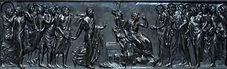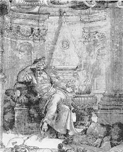 During the Baroque reconstruction of the chapel, the tombs were finished and simplified by Bernini. Originally the medallions were probably made of bronze, the epitaphs were to be written on gilt copper plates, and three sides of the bases were to be decorated with bronze reliefs. A sketch attributed to Giovanni Antonio Dosio (c. 1570) in the Uffizi shows the original form of Agostino's pyramid with the plate and the medallion missing. Another drawing, an architectural phantasy with the figures of Pyramus and Thisbe by Jean Lemaire (c. 1650) shows a similar pyramid obviously inspired by the one in the Chigi Chapel before it was restored by Bernini.[20] A modello drawing for a tapestry by Francesco Salviati (c. 1548) shows the same monument crowned with a cap and small bronze ball which were later removed (or never existed).