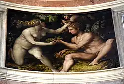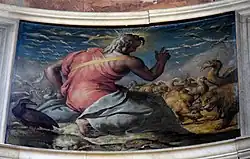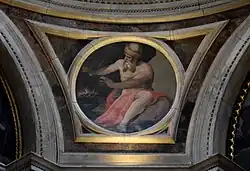 The frescos between the windows of the drum (c. 1552-1554) depict scenes from the Book of Genesis in order: Separation of Light from Darkness, Creation of the Sun and the Moon, Creation of the Earth, Creation of Adam, Creation of Eve, Creation of the Animals, The Original Sin and Expulsion from Paradise. The paintings show the strong influence of the sculptural style of Michelangelo's famous Genesis-cycle on the ceiling of the Sistine Chapel.[11] The scenes are not in strictly chronological order. The first five are the same as the parallel Genesis paintings in the Sistine Chapel but the sixth fresco adds a new subject, the creation of the fishes, birds and wild animals. The sixth scene of the Sistine ceiling is separated into two individual paintings on the drum of the Chigi Chapel. Salviati's cycle ends here, and the three scenes from the story of Noah, that make up the last section of Michelangelo's great sequence, are missing.