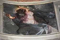 The four tondi of the spandrels depict allegoric representations of the Seasons. In 1653 they were restored by Antonio della Cornia by order of Fabio Chigi. The murals were described as being seriously damaged in 1842.[10] The iconography of the paintings is classical. Spring is represented as a young woman holding a bouquet of flowers with a floral wreath on her head; Summer is a woman holding ears of grain with a wreath of wheat on her head; Autumn is a young man under a grapevine with a cup; and Winter is an old man in a fur hat warming his hands by a brazier. A small ram by the shoulder of Spring is a symbol of Aries, the first sign of the zodiac and connected to the vernal equinox. The portrayal of Ver (Spring), Aestas (Summer) and Autumnus (Autumn) follows Ovid's description of the seasons in his Metamorphoses (Met 2.27-30) while the allegory of winter was inspired by the "February-by-the-fire" motif of medieval calendar tradition. The former three personifications can also be interpreted as ancient Roman deities: Flora/Proserpina, Ceres and Bacchus. The tondi were damaged in different degrees, the most seriously the allegory of Autumn. During a recent restoration the 17th-century bronze frames were removed.