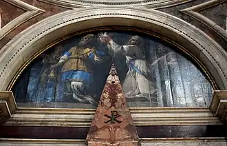 The lunettes are filled with oil on wood panels of Raffaello Vanni, commissioned by Fabio Chigi in 1653. The theme of these often overlooked paintings is somewhat enigmatic, giving rise to different interpretations. In the guides they are often described as "David and Saul" and "Eli and Samuel" or simply - and wrongly - as "prophets". The clue to their real meaning was given by a well-informed contemporary description which remained unpublished: Benedetto Mellini's Saggio della Roma Descritta which was written around 1656. Mellini states that the panel above Sigismondo's tomb represents The royal ancestors of the Virgin, while the other panel above Agostino's tomb shows The sacerdotal ancestors of the Virgin.[24]