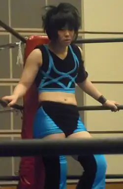 On September 11, 2008, Tomiya moved from her hometown of Utsunomiya, Tochigi to Tokyo to begin training professional wrestling under Emi Sakura.[3] Sakura gave her the ring name Chii Tomiya by combining the Japanese word chi (ち, chi), which indicates smallness or quickness, with the name of her hometown Utsunomiya (宇都宮市, Utsunomiya-shi).[1] After less than a month of training, Tomiya made her debut for Sakura's Ice Ribbon promotion on October 7, losing to her trainer 3–0 in a five-minute exhibition match.[2] Tomiya made her "official" debut on October 18, losing to Yuki Ueda.[4] For the first months of her career, Tomiya wrestled several matches against Makoto, always ending up on the losing side.[5][6][7] Finally, on January 18, 2009, Tomiya picked up her first win, pinning Yuki Ueda in a tag team match, where she teamed with Minori Makiba and Ueda with Yoshiko Tamura.[8] On February 7, Tomiya faced one of her idols,[1] NEO Japan Ladies Pro Wrestling representative Tanny Mouse, in a losing effort.[9] The match eventually led to a partnership between the two.[10][11] On March 22, Tomiya made her debut for NEO Japan Ladies Pro Wrestling, during which she won her first championship, when she surprised Tanny Mouse and pinned her after a match to win DDT Pro-Wrestling's Ironman Heavymetalweight Championship, taking advantage of the title's rule, where a champion could be pinned anytime, anywhere.[12] She would lose the title to Cherry later that same day.[12] On June 3, Tomiya defeated nine other wrestlers to win a battle royal, her first accomplishment in Ice Ribbon.[13] During 2009, Tomiya continued regularly wrestling Makoto, including losing to her on August 5 in a match to determine the number one contender to Ice Ribbon's top title, the ICE×60 Championship.[14] Tomiya would eventually receive her first shot at the title on October 23, but was defeated by defending champion Emi Sakura.[15] On November 14, Tomiya formed the tag team named Miniature Dachs with Riho, with the two defeating Hikari Minami and Mai Ichii in their first match together.[16][17]