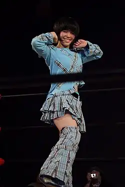 Chii Tomiya (都宮 ちい, Tomiya Chii; born April 25, 1991)[1] is a Japanese professional wrestler, best known for her work in the Ice Ribbon promotion. Trained by Emi Sakura, Tomiya made her debut for Ice Ribbon in October 2008 and during the next three years went on to become a one-time International Ribbon Tag Team and Internet Wrestling 19 Champion, while also holding DDT Pro-Wrestling's Ironman Heavymetalweight Championship once. In August 2011, Tomiya left Ice Ribbon and became a freelancer, adopting the new ring name Micro (ミクロ, Mikuro) in the process. As a freelancer, she would most notably work for the Reina X World promotion, where she wrestled as the masked character Mini Tomato (ミニトマト, Mini Tomato). In September 2013, she signed with the new World Pro-Wrestling Association (WPA) promotion, adopting the new ring name Akubi in the process. Standing at only 1.42 m (4 ft 8 in), she is one of the shortest wrestlers in all of puroresu.