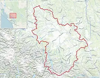 The Chilcotin River /tʃɪlˈkoʊtɪn/[5] located in Southern British Columbia, Canada is a 241 km (150 mi) long tributary of the Fraser River.[6] The name Chilcotin comes from Tŝilhqot’in, meaning "ochre river people," where ochre refers to the mineral used by Tŝilhqot’in Nation and other Indigenous communities as a base for paint or dye.[7] The Chilcotin River, Chilko River and Lake, and Taseko River and Lake make up the Chilcotin River watershed.[7] This 19,200 km2 (7,400 sq mi) watershed drains the Chilcotin Plateau which reaches north to south from the Nechako Plateau to Bridge River county and east to west from Fraser River to the Coast Mountains.[7][8] It is also one of twelve watersheds that make up the Fraser River Basin.[7] Made up of seven major tributaries, Chilcotin River starts northeast of Itcha Mountain, flowing southeast until it joins the Fraser River south of Williams Lake, 22 km (14 mi) upstream from Gang Ranch.[6][7]