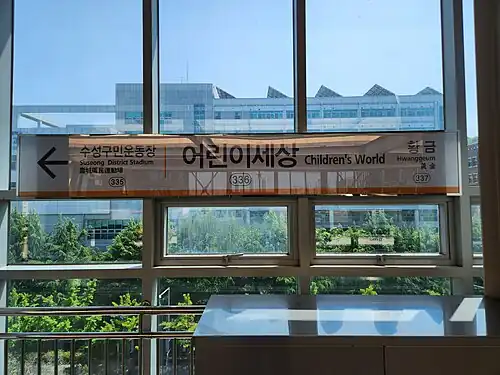 Children's World Station (Korean: 어린이세상역), formerly Children's Hall station, is a station of the Daegu Metro Line 3 in Hwanggeum-dong, Suseong District, Daegu, South Korea.