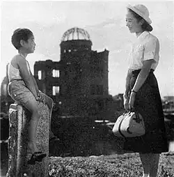 The film commemorates the a-bomb attack on Hiroshima and the tragedies that followed, which the U.S. forces censored during their occupation of Japan that ended months before the film’s release.[11] The film commemorates the hibakusha people and highlights how they were ostracized in Japanese society through characters who are refused work due to their visible injuries caused by the bombs and the radiation.[11] However, the film also promotes Japan’s sentiment of victimization through the tragedy of nuclear attacks. It leaves out the struggles of other Asian countries during the war and how Japan was also a victimizer.[12] There is a lack of a larger context of wartime Japan within the film as it depicts Japan as a calm and prosperous place before the bombs. The film displays the victimization of Japan in flashback scenes of the bombing, where children cry over their dead mother's bodies, representing a broken bond of life.[12] The film’s emphasis on the destruction that followed the bombing resonates with the anti-war and pro-democracy messages of several social interest groups, including the Japan Teachers Union.[13]
