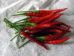 The chile de árbol (lit.'chili from tree') is a small and potent Mexican chili pepper also known as bird's beak chile and rat's tail chile. These chilis are about 5 to 7.5 cm (2.0 to 3.0 in) long, and 0.65 to 1 cm (0.26 to 0.39 in) in diameter. Their heat index is between 15,000 and 30,000 Scoville units. The peppers start out green and turn a bright red color as they mature. Chile de árbol peppers can be found fresh, dried, or powdered. As dried chiles, they are often used to decorate wreaths because they do not lose their red color after dehydration.[1]