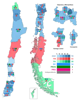 Following an election reform in 2015, the Chamber of Deputies grew in size to 155 members from the previous 120, while the Senate increased its membership from 38 to 43 after this election, and will grow to 50 following the election in 2021.[1] Multi-seat constituencies were reestablished, replacing the previous binomial system of two seats per district, installed by the outgoing Pinochet dictatorship in 1989.[2][3] Starting with this election, Chile's congress was elected through open list proportional representation under the D'Hondt method. Also for the first time, a 40% gender quota was put in place for candidates of each political party in parliamentary elections.[4]