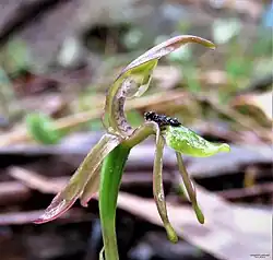 Chiloglottis palachila, commonly known as the spade-lipped wasp orchid,[2] is a species of orchid endemic to some of the higher places in northern New South Wales. It has two leaves and a single green to greenish pink flower with a black, ant-like callus on the base of the labellum. The tips of the lateral sepals have distinctive swollen, brown glandular tips.