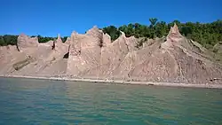 The bluffs are formed from eroded drumlins, teardrop-shaped hills of glacial till that were deposited and shaped by glaciers during the most recent ice age. The erosive power of wind, rain, snow, and waves has formed the landscape into sharp pinnacles.[5] Although the pinnacles and cliffs, some of which rise up to 150 feet (46 m) above the lake shore,[6] have existed for thousands of years, they are constantly changing and further eroding.[5]