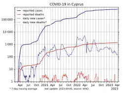 On April 2, 2020, the Chinese Embassy in Cyprus and Chinese businesses donated medical supplies to Cyprus, including 1,320 safety coveralls, 5,000 KN95 masks, and 5000 disposable medical masks.[13] To help ease the scarcity of medical supplies, the Chinese Embassy in Cyprus has provided 14,000 disposable medical and non-medical masks to the municipality of Pafos, local clinics, schools, and government departments for free.[13]