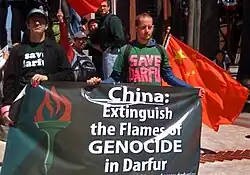 Members of the United States Congress, advocacy groups such as the Save Darfur Coalition, and some Hollywood actors called for a boycott of the 2008 Olympic Games in Beijing seeking to pressure China to halt its arms sales and withdraw investments from Sudan.[2] The Save Darfur coalition had turned its attention to China after failing to persuade Western governments to intervene directly.[14]: 84  The Save Darfur coalition's view was that China had close ties with Sudan especially in the oil industry and had resisted United Nations Security Resolutions on the crisis in Darfur.[14]: 84  China initially opposed any special responsibility to act with regard to the crisis.[14]: 84  China's Special Representative on African Affairs Liu Guijin stated that "Darfur is not China's Darfur. Firstly, it is Sudan's Darfur and second it is Africa's Darfur."[14]: 84