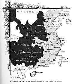 ...the startling fact that even in the seven provinces in which such work had begun there were still a hundred and eighty-five millions utterly and hopelessly beyond the reach of the gospel....And beyond these again lay the eleven inland provinces - two hundred millions more without a single witness for Christ[4]