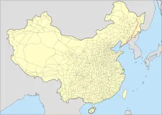 China National Highway 201 (G201) runs from Hegang, Heilongjiang Province to Lushunkou, Liaoning Province.[1] It is 1,964 kilometres in length and runs southeast from Hegang towards the border with Russia before turning southwest, going via Mudanjiang, Heilongjiang Province and Dandong, Liaoning Province.[2][3]