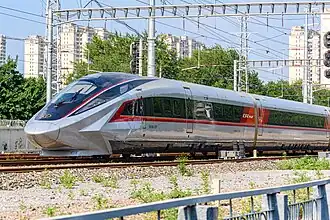 The CR450AF Fuxing (Chinese: 复兴号; pinyin: Fùxīng Hào) is a prototype Chinese electric high-speed train manufactured by CRRC Qingdao Sifang. As part of the China Standardized EMU family, the CR450AF has an operating speed of 400 km/h (249 mph) and a maximum design speed of 450 km/h (280 mph). Once in service, it will be one of two trains that have the highest operating speed in the world, with the other being CR450BF.[1]