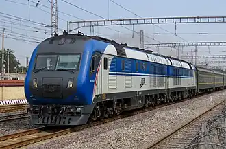 The DF11G (Chinese: 东风11G, nickname: 猪头) is a twin unit semi-high-speed diesel-electric locomotive used on the People's Republic of China's national railway system. This locomotive was built by Qishuyan Locomotive and Rolling Stock Works. DF11G Diesel Locomotive is a twelve shaft fixing reconnection passenger diesel locomotive which based on two six-axle locomotives connected.