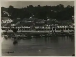 Early transportation in South East Asia were heavily dependent on rivers. Therefore, Chinese settlers usually named the first street near the river as "Hai Gan Street" (海乾街) which means "at the edge of river/sea". However, Hai Chun Street (海唇街, meaning lips of the sea) was given for the first street in Kuching (now popularly known as "Main Bazaar") near Sarawak River.[1] It is the oldest street in Kuching.[2] Wharves and jetties can be found nearby the street for loading and unloading of goods.[3] Hong San Si Temple (鳳山寺) is located in the east while the Old Court House is located in the western part of the street. In 1839, while Sarawak was still under the Bruneian Empire administration, the area was inhabited by only a few households while the surroundings were covered by forests.[1] According to official Chinese documents, there were about 20 Chinese pioneers managing vegetable farms at Satok area.[4] After James Brooke took Sarawak (present day Kuching) from the Bruneian Empire, security in the area improved. This has attracted an influx of Chinese immigrants into this place. The earliest settlers in the area were the Hokkien businessmen who stayed near the Tua Pek Kong temple (古晉大伯公廟). Teochew businessmen later built more shophouses along the street and named the western part of the street as "Shun Feng Street" (顺丰街) which means "smooth and abundant". Shophouses at the Hai Chun Street were made of wood and attap dwellings. Near the present day Chinese History Museum was the first market in Kuching selling fish, meat, and vegetables. Therefore, the Hai Chun Street is also known as Main Bazaar. In 1863, Frederick Bayle described the Hai Chun Street as follows:[1]