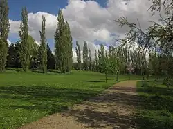 The park is around half a mile long north to south, about half as wide east to west and is surrounded by and has entrances on Chinbrook Road and Amblecote Road to the north, Mayeswood Road to the east, a railway line and Portland Road to the south and west, and Elmstead Wood to the south. Under the railway line there is a pedestrian subway tunnel that crosses the borough boundary into Bromley and links the park to a much smaller green area southwest of the main park. There is no gate separating the two, but the smaller area, being under the authority of another borough the London Borough of Bromley, is sometimes not considered part of the same park, the map on the website does not show it, but shows the park entrance to be the pedestrian subway.[3] The footpath that leaves the southeast corner of Chinbrook Meadows is part of the Green Chain Walk passes some allotments then Grove Park Cemetery before entering Elmstead Wood.