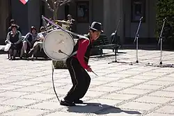A Chinchinero is an urban street performer in Chile, usually a man or young boy, who plays a bass drum-type percussion instrument with long drumsticks strapped to his back which also involves a rope with a noose tied around the performer's foot to play the cymbals which also form part of this improvised instrument. Said instrument has been invented and produced informally and can carry any rhythm or melody.
