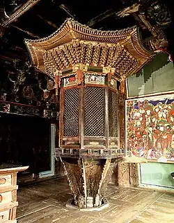 After printing, a canon would usually be stored monasteries and temples. Many monasteries in imperial China also had specific buildings where their copies of the canon were stories, which were called Tripitaka Pavilions (zangjingge 藏經閣) or Tripitaka Tower (jingge 经阁 or jinglou 經樓).[29] Temples also had special cabinets produced for storing canonical texts. These huge cabinets were called "tripitaka cabinets" and were of different designs. Some were built into the walls of a library, others were revolving repositories (lunzang 輪藏) that could be turned to easily access different texts.[4] These revolving storage structures were also devotional items, as it was often believed that turning these repositories could bring good merit.[30]