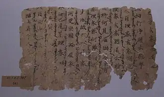 From the Han to the Song dynasty era, many translations were made and made new texts were also composed in China.[16] During the Eastern Jin and the Sui Dynasties, the earliest canons were compiled using manuscripts.[4][16] None of these early manuscript canons have survived.[4] The earliest surviving manuscripts from the early Chinese canons are found in the Dunhuang text collections and the earliest catalogue of the contents of the canon is the Lidai sanbao ji 歷代三寳記 (Records of the Dharma Jewels through the Generations) by Fei Changfang (fl. 562–598).[17] There are also many early manuscripts which have survived in the libraries of Japanese temples.[17]