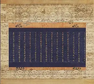 The Buddhist canon, known as the Issaikyō (一切經, lit. "the entirety of the scriptures") in Japanese, also played an important role in the history of Japanese Buddhism. The canon was first chanted in 651 at a royal palace and in 673, Emperor Tenmu ordered the Issaikyō to be copied in full. During the Nara period (710-794), the imperial government led a large-scale copying of the Issaikyō at Tōdaiji. At least twenty nine manuscript canons were copied during the Nara period and many manuscripts from this period have survived.[49] In the following eras, the canon was widely copied and maintained at various temple libraries and repositories, often with support from the government or important nobles. Some early important libraries included the collection at Nanatsudera 七寺 (in Nagoya) and the library at Bonshakuji.[50]