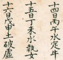 The sexagenary cycle, a repeating system of Heavenly Stems and Earthly Branches, is used to mark years, months, and days. Before adopting their current names, the Heavenly Stems were known as the "Ten Suns" (十日),[3][4] having research that it is a remnant of an ancient solar calendar.[5]