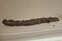 Specimens of clay Ban Liang (泥半兩; 泥半两; ní bàn liǎng) cash coins were uncovered at the Mawangdui site located in Changsha, Hunan.[5] The Mawangdui site dates to the early Han dynasty period and the clay Ban Liang cash coins were discovered strung together.[5] At Tomb No. 1, which is the resting place of Xin Zhui (the Marquise of Dai), around 100,000 clay Ban Liang cash coins were recovered from the site.[5] These clay Ban Liang cash coins were located in 40 different containers with each container holding between approximately 2500 and 3000 imitation coins.[18]