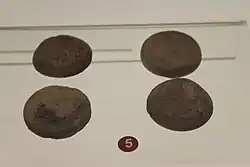 Han dynasty Jinbing can display Chinese characters which have been identified as reading 齊 (qí), 土 (tǔ), 長 (cháng), 阮 (ruǎn), 吉 (jí), 馬 (mǎ), 租 (zū), 千 (qiān), 金 (jīn), 王 (wáng), and "V".[5] Other Chinese characters found on Jinbing require further research to be deciphered.[5] Clay imitations of Jinbing (陶質"金餅"; 陶质"金饼"; táo zhì "jīn bǐng"), or mingqi (冥器; míng qì), are also at times found in tombs that date to the Han dynasty period.[5] Like the actual Jinbing, some clay imitations also feature Chinese characters at the bottom.[5] Some inscriptions that have been found on clay Jinbing include feng nian tian (豐年田; "fields of bountiful harvest") and Zhiqian Baiwan (直錢百萬; "has a nominal value of 1,000,000 cash coins").[5]