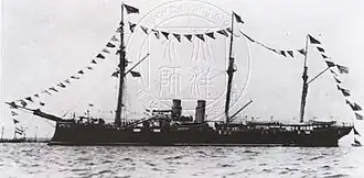 Her initial armament consisted of two 8.2 in (21 cm) breach-loading Armstrong guns, alongside eight 4.7-inch (12 cm) breach-loading Armstrong guns and some Hotchkiss guns.[2] The two larger guns were mounted in sponsons ahead of the funnels, while the smaller Armstrongs were placed amidships as a broadside, on the forecastle and poop deck and in further sponsons ahead of the poop.[3] Although the ship was launched in Germany, that armament was added by Armstrong Whitworth while Nan Chen was at its shipyard in Elswick, England.[2] By 1884, she was equipped with a torpedo boat.[4]
