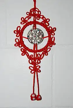 Chinese knotting (中國結) is a decorative handicraft art that began as a form of Chinese folk art in the Tang and Song dynasty[1] (AD 960–1279) in China. It was later popularized in the Ming. The art is also referred to as Chinese traditional decorative knots.[2] One of the more traditional art forms, it creates decorative knot patterns. It was not practiced during the Culture Revolution,[3] but nowadays it is very popular again.