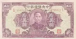 In the 1935 currency reform, the Nationalist government of China abandoned the traditional silver standard, in response to deflation caused by rising silver prices, and introduced its own paper currency, the Chinese National Currency (CNC).[1] However, this currency was issued without sufficient credit or reserve backing. The Nationalist government's reliance on deficit spending led to unchecked monetary expansion, resulting in rapid currency depreciation. This situation was aggravated by the financial burden of the Second Sino-Japanese War and the subsequent Chinese Civil War.[3] To control the price hike, the government tried to introduce a new currency, namely the Chinese gold yuan (GY) in 1948,[4] along with price and wage controls, which proved infeasible due to extensive corruption and administrative failures.