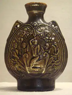 Such mixed influences are especially visible in the earthenwares of Northern China in the 6th century, such as those of the Northern Qi (550–577) or the Northern Zhou (557–581).[5][6] In that period, high quality high-fired earthenware starts to appear, called the "jeweled type", which incorporates lotuses from Buddhist art, as well as elements of Sasanian designs such as pearl roundels, lion masks or musicians and dancers.[5] The best of these ceramics use bluish green, yellow or olive glazes.[5]