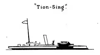 Tien-sing was the only ship of its type constructed, which was built out of spare iron and an extra 17 cm Krupp gun at the Kiangnan Arsenal. It had been intended for ironclads to be built there, and Tien-sing was constructed while the ironclad building yard was also under construction.[1] This made her the first home built ironclad in Chinese service,[2] with the vessel known locally as "The Terror of the Western World".[1] Her design was later compared to that of HMS Staunch of the Royal Navy, but with additional protection for the Krupp gun.[3] Originally named Chin-ou,[1] she was 104 feet (32 m) long overall, had a beam of 20.3 feet (6.2 m) and an average draft of 6.8 feet (2.1 m). She displaced 195 long tons (198 t). The propulsion system consisted of a 340 ihp (250 kW) reciprocating engine with twin shafts. Her engines produced a cruising speed of 10 knots (19 km/h; 12 mph).[3] She had a total crew complement of 40.[4]