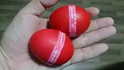 Chinese red eggs (紅蛋, 紅雞蛋) are bright pink hard-boiled chicken eggs used in Chinese cuisine. After boiling, a wet red calligraphy paper is wiped over the eggs to create a pink coloring.
